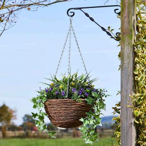 Decorative garden feature Retail swing tag or sticker on product; 1 (4 per master carton) Natural wicker with UV resistant plastic; purple and yellow flowers Product Dimensions: W30 x D30cm