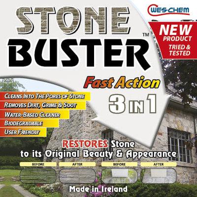 Wes-Chems Stone Buster fast action 3 in 1. Restores stone to its original beauty and appearance. Cleans into the pores of all natural stone, removes dirt, grime and soot. Stone Buster is a biodegradable water based cleaner.